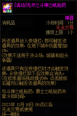 首先就是必拿的无尽斗神之吼药剂。相信在之前活动使用过它的小伙伴都忘不掉它带来的安逸,不用可以顶着冷却时间按时吃药,也不会因为忘吃药而少打伤害。