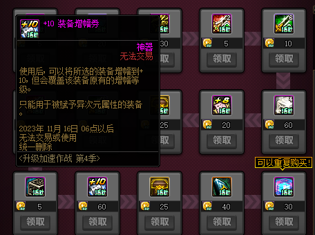 这个活动的重点奖励为+10装备增幅券。获取这个需要我们达成成为巴卡尔攻坚战司机的条件,也就是名望达到45142以上且拥有5件巴卡尔攻坚战融合装备。使用与两个嫩芽一起通关后获取的司机硬币兑换+10装备增幅券。