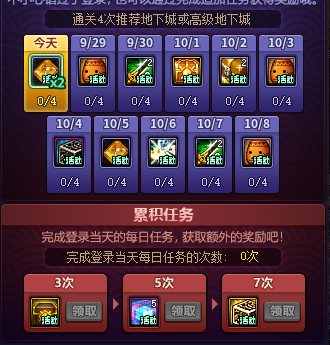 这个活动是9月28日到10月8日的登录活动,在对应日期当天登录并通关四次地下城或者高级地下城就可以获取当天的奖励。