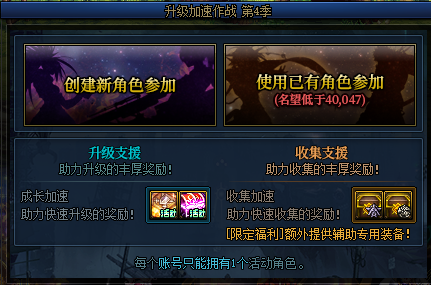 这次的升级加速作战活动限定新创建或者名望低于40047的已有角色参与。强化+12锻造8武器可以在升满级后直接获取,定制宝珠套装礼盒可以在名望到达33043后获取,+10装备增幅券和增益技能白金徽章自选礼盒则需要在升满级后使用完成每周任务获取的成长之路硬币按顺序兑换。