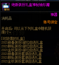 绝版装扮礼盒神秘袖珍罐有概率开出21年的整套绝版装扮,可以在通行券达到45级后获取,次元晶体可以在通行券等级到达50级后获取。
