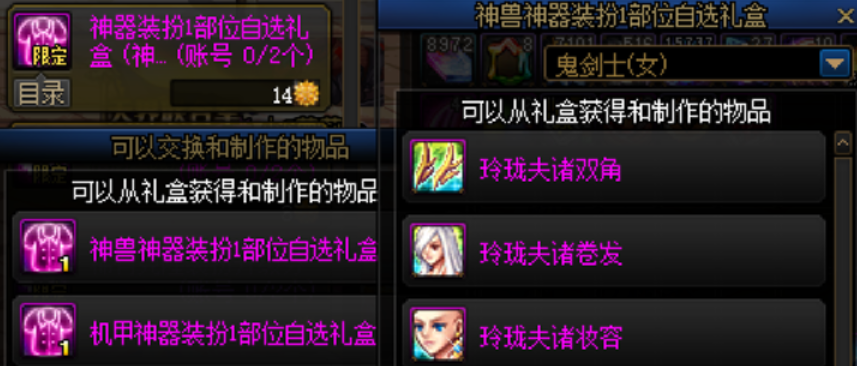 包括直接兑换一件神器装扮自选礼盒和将已有的稀有/神器装扮升级为克隆装扮的升级券,请各位勇士注意分辨。其中[神器装扮1部位自选礼盒]可选目前产出途径较少的神兽神器装扮。