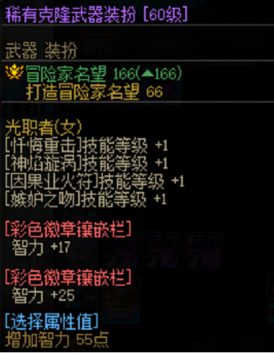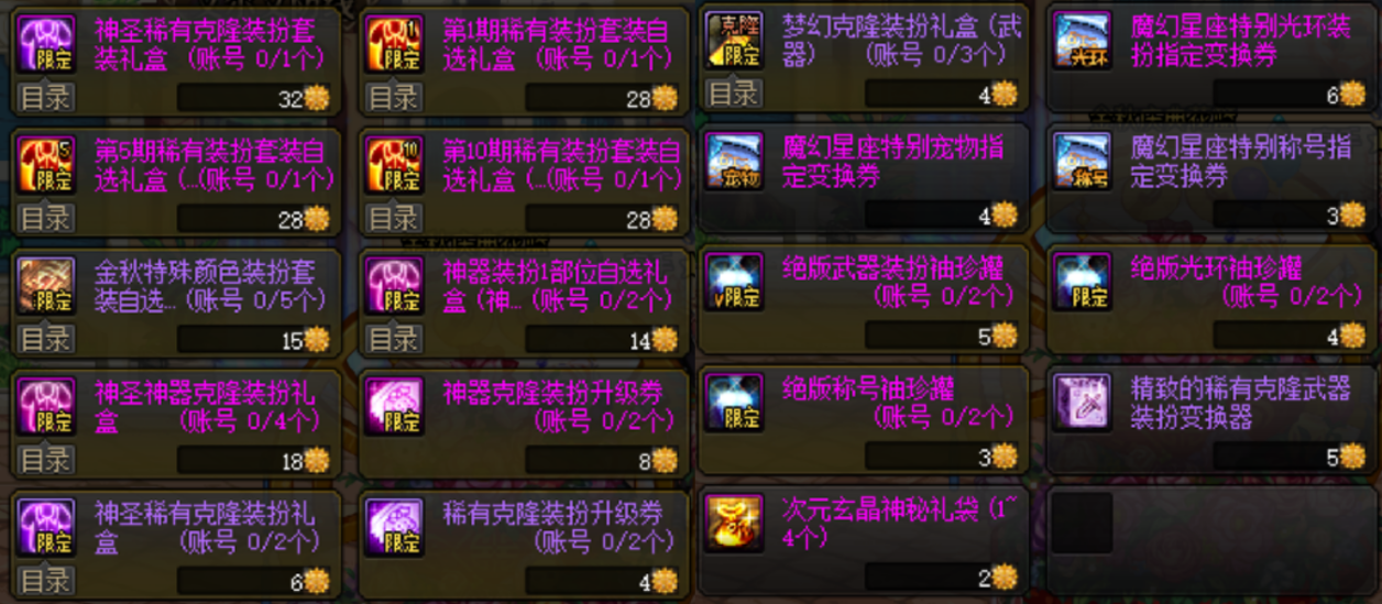 [梦幻克隆装扮礼盒(武器)]和[精致的稀有克隆武器装扮变换器]二者搭配使用,只需9个装扮凭证(购买2套金秋礼包)即可获得一件稀有克隆武器装扮,但由于精致变换器无法指定变换后的技能等级,因此主要适合给辅助职业兑换,装扮自带的四维加上镶嵌的徽章对增益量的提升依旧十分显著。