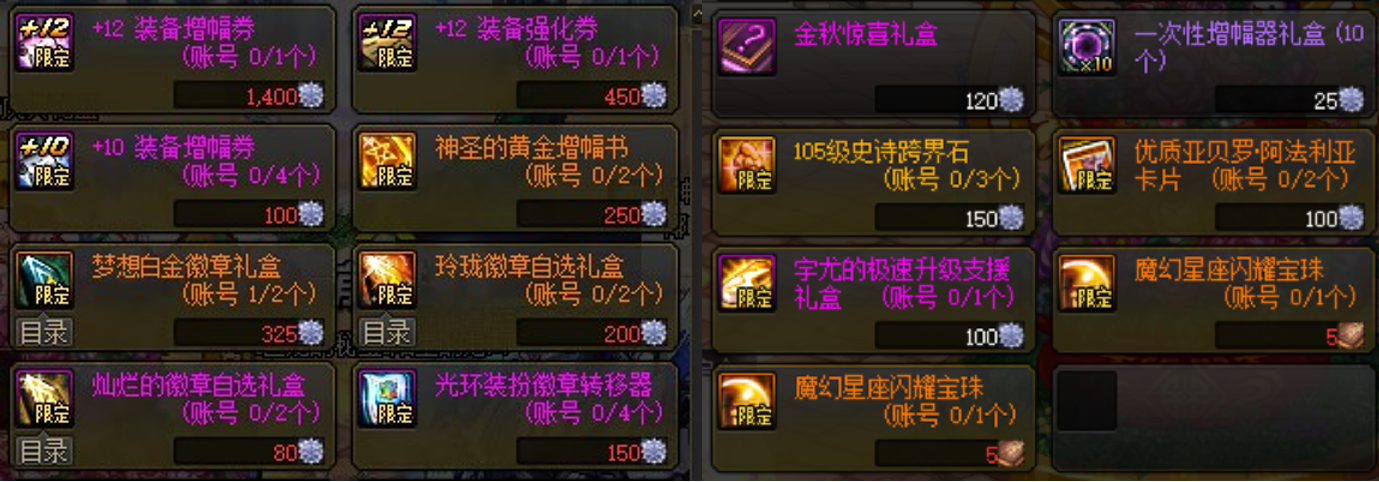 若购买十套及以上金秋礼包可考虑兑换+12装备增幅券保底;升级加速作战之外仍有武器强化需求的勇士可兑换+12装备强化券;需保留之前光环徽章的勇士可兑换徽章转移器;有多余凭证想要拼运气的勇士也可兑换神圣的黄金增幅书或金秋惊喜礼盒;其他特别凭证兑换道具因性价比不高不推荐兑换。