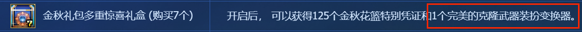 PS:购买7套金秋礼包将在多买多送奖励中赠送一个可以指定技能等级的完美变换器,购买7套及以上金秋礼包的勇士需要留言以免多换导致装扮凭证浪费。