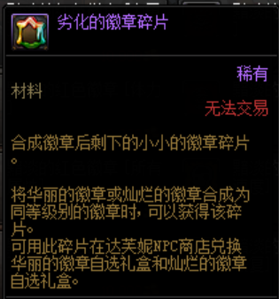 使用劣化的徽章碎片可以在达芙妮处兑换华丽和灿烂的徽章自选礼盒。劣化的徽章碎片为合成徽章失败后的产物。