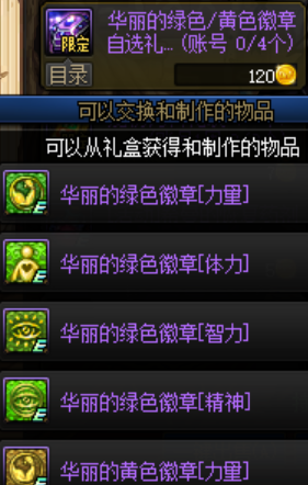 在商店内可以用120个探索硬币兑换1个华丽的绿色/黄色徽章自选礼盒,一共可以兑换4个,该礼盒内的绿色/黄色徽章包含力量、智力、体力、精神徽章。除了徽章礼盒外还有镶嵌栏开启装置可以兑换。