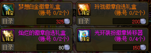 在花篮内可以用特别花篮兑换梦想白金徽章礼盒、玲珑徽章自选礼盒和灿烂徽章自选礼盒。如果只是给装备镶嵌玲珑徽章堆名望值,可以兑换两个灿烂徽章去合成,比单兑换玲珑徽章少40个特别花篮。