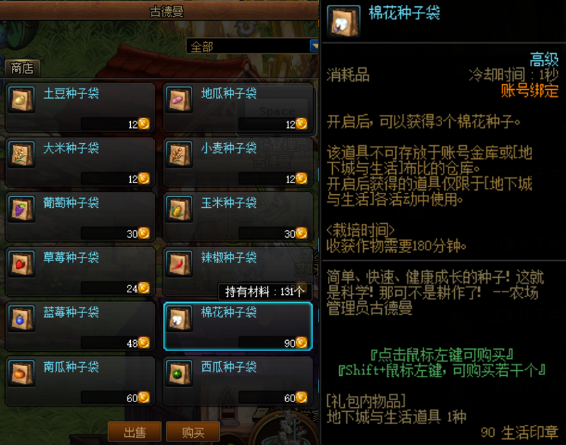 种植方面,在钓鱼之余推荐留行动点数种棉花。棉花种子90金币3个,种植时间3小时,1个棉花90金币。推荐在下线前种上,等第二天上线的时候收棉花就能净赚180金币,比每日任务还多。