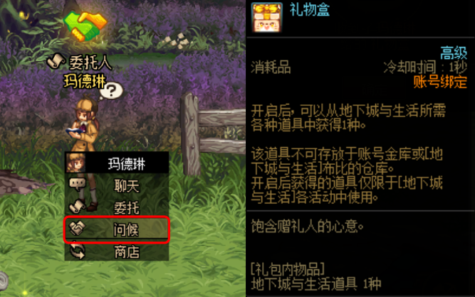 等待种植的时间可以找门口的访客完成每日委托,第一次来家园的系统角色点击“问候”,可以领取一个礼物盒。委托任务需要提供各类物品,一般在家园NPC商店有售,或者可以通过喷泉采集/作物种植获得。