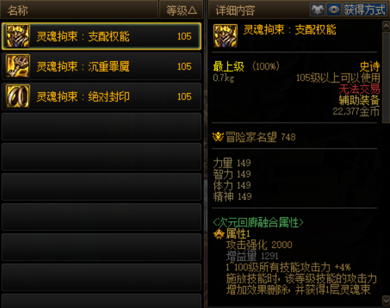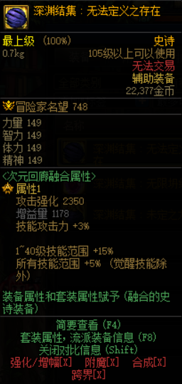 主要加成为属性强化、三速和抗性,不过这些属强与深渊结集的技能攻击力比起来,还是有所差距的,一般情况下不做选择。