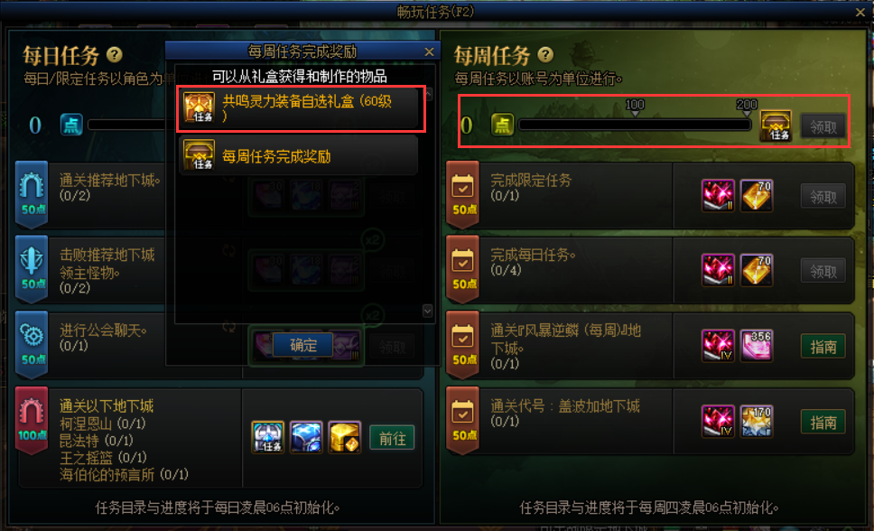 完成每周畅玩任务可以获得每周任务奖励,打开之后可以直接获得5个共鸣灵力史诗自选礼盒,词条等级固定为60级。勇士们参与其他副本获得60级以下的史诗装备,笔者建议不必浪费材料喂养,直接分解使用每周任务奖励即可。