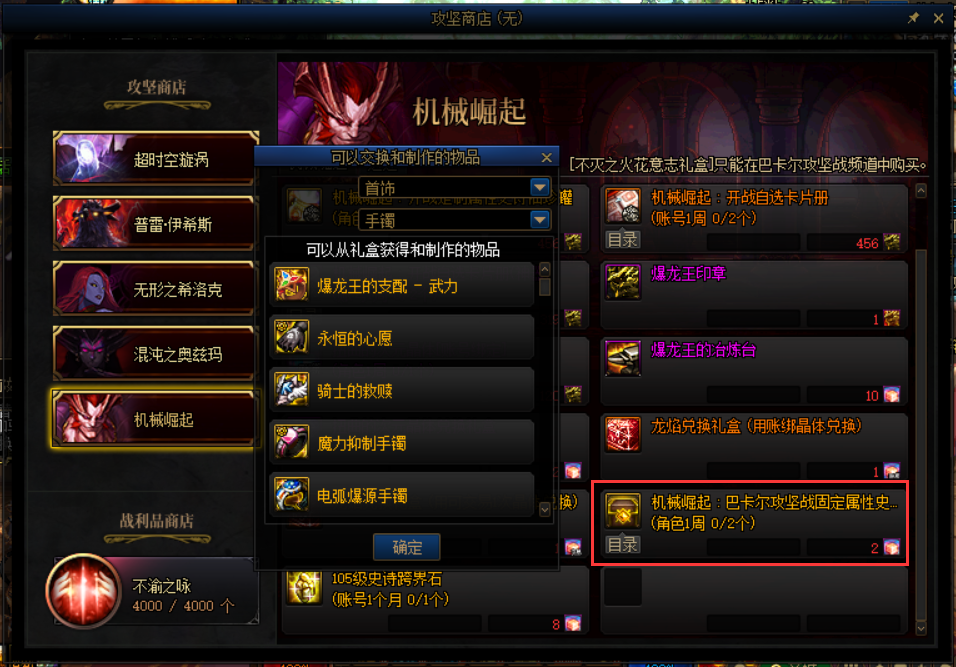 巴卡尔攻坚商店当中可以使用扭曲的次元晶体-龙焰兑换固定属性史诗自选礼盒,打开之后获得的装备词条等级固定为75级。这个礼盒勇士们需要特别注意,可以在极大程度上助力装备词条等级达成满级80级,也是后续装备词条等级满级培养的主要思路。
