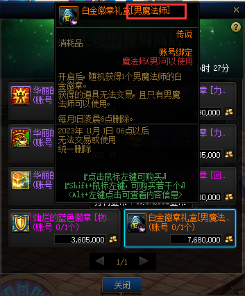 ②商店的白金徽章包含随机本职业白金和梦想白金,随机职业的只有职业对应后缀的职业才能开启,如图所示,男魔法师的只能男魔法师开,如果只是出于合成的话,买之前记得看一眼,不然职业不同无法开启。白白浪费金币。