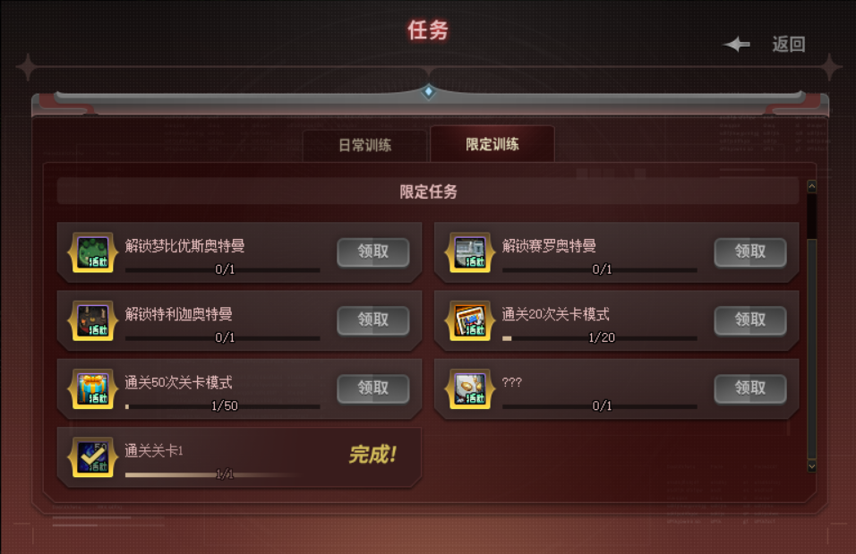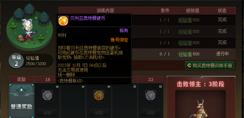 奥特曼训练手册分为普通奖励和训练奖励,若不使用7800点券解锁训练奖励的话,我们依然可以通过完成每日任务解锁免费奖励。免费奖励内容包含20枚赛罗奥特曼硬币和5枚贝利亚奥特曼硬币。