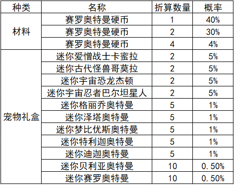 奥特曼训练手册当中可以免费获得5枚贝利亚奥特曼硬币,勇士们可以在奥特曼宠物扭蛋机当中抽取奖励,不过奥特曼宠物获取概率为随机,具体道具获取概率可以见下表: