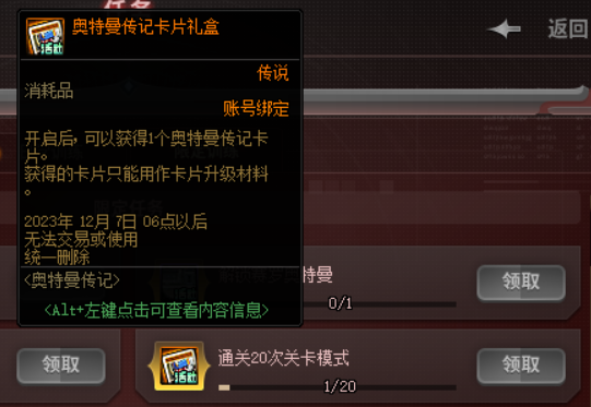 通过完成小游戏的限定任务“通关20次关卡模式”,可以获得一个奥特曼传记卡片礼盒。