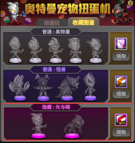 通过获取不同种类的宠物,收集齐隐藏:光与暗栏目即可获得一个奥特曼装扮自选礼盒。
