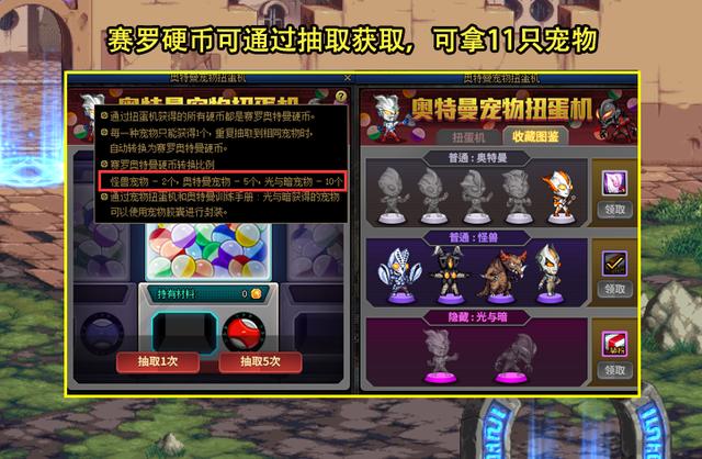 那么肯定有人问,怎么获得这么多赛罗硬币兑换呢?那就得在奥特曼宠物扭蛋机活动中了,奥特曼宠物扭蛋机主要获得的奖励为宠物,最高可通过抽取获得11只,如果抽到相同的则会转换对应的赛罗硬币。