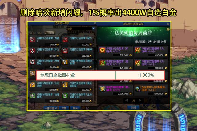 达芙妮每周商店改版后,将下架暗淡徽章,变成闪耀徽章,包含闪耀三攻及闪耀白金!同时达芙妮还新增了每周商店,在每周商店中,每周会刷新5件B级物品、2件A级物品、1件S级物品,其中出现价值4400万的梦想白金徽章概率较低,仅有1%的概率。