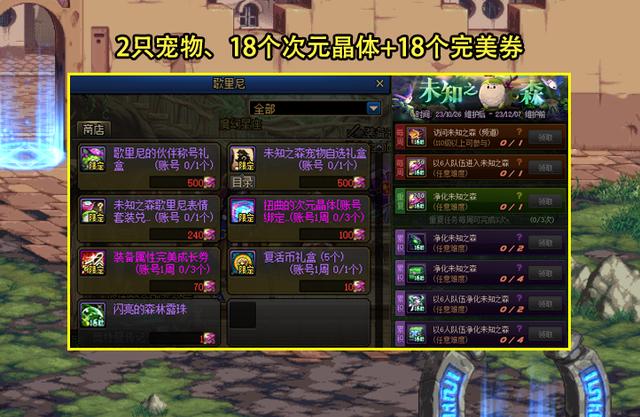 未知之森是新增的副本,分为未知之森、隐藏之森2种!其中隐藏之森名望要求较高,需要45142点,且每周只能刷一次。在副本上线后还联带推出了未知之森活动,核心奖励是商店的1只宠物、18个次元晶体、18个完美成长券,以及累积6人通关未知森林的1只宠物。