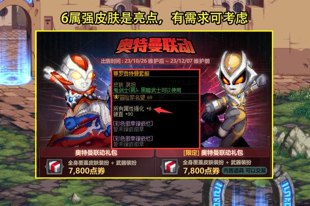 首先,奥特曼礼包分为普通款和限时款这2种,这2款的礼包售价相同,都是78,但是限时款只能购买1次,且内含的皮肤+武器装扮可交易的。礼包的奥特曼分为卡密拉、贝利亚、格力乔、赛丽这4种,其中给玩家最大亮点的是皮肤+6属强,对奥特曼有兴趣,且没6属强皮肤的玩家可考虑入手。