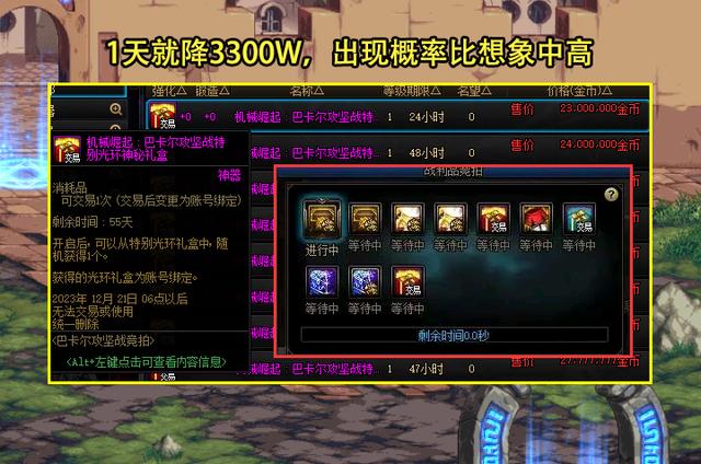 总的来说,巴卡尔加入的光环礼盒,仅过1天价格就砍半也是让人瞠目结舌,可以说是降价最快的竞拍道具了,在团本还未重置前,就降价这么多,在团本重置后将不得了,想追求无形法则光环的玩家,等到团本再次重置后再买也不迟,不过那时候无形法则光环也没这么稀有了,但至少可以圆自己一个梦。