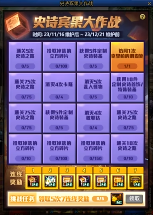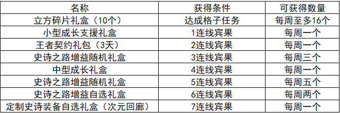 活动期间,活动栏当中将会添加史诗宾果大作战活动图标,进入活动界面之后,只要完成任务界面中的任务,将完成后的任务连成一条线,即可获得活动奖励。