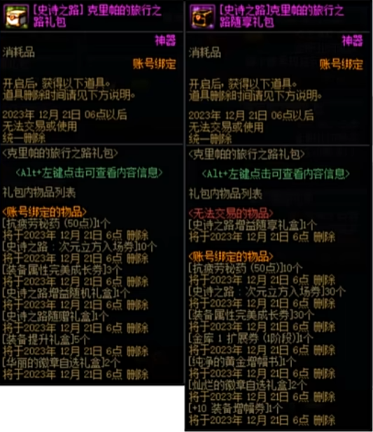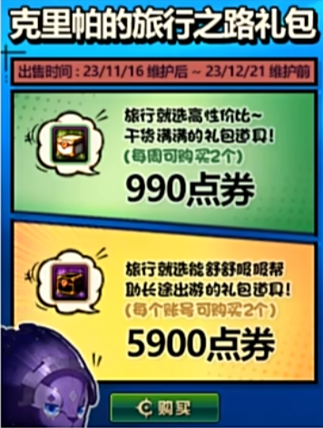 活动期间,商城当中将会上线克里帕的两款礼包,分别是克里帕的旅行之路礼包和克里帕的旅行之路随享礼包,前者售价为990点券,每个账号每周可以购买两次,后者售价为5900点券,每个账号限定购买两次。这两款礼包都旨在助力角色参与史诗之路,有需求的小伙伴可以入手一波。