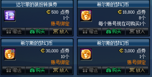 梦幻币可以在商城当中购买,3000点券一个,每个账号有一次折扣机会,8个梦幻币18800点券,不过梦幻币只能使用点券购买,不能用代币券抵用,有点小贵。