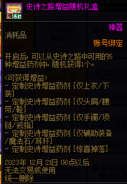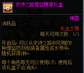 另外本次史诗之路活动掉落buff使用次数比较紧缺,礼包内的增益随享礼盒有效的弥补了这一点(尽管获得的buff是随机的)。