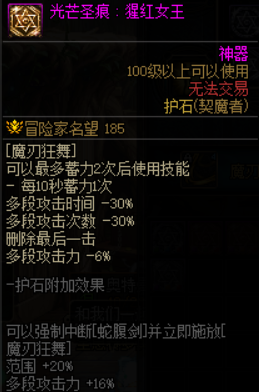 剑魔魔刃狂舞护石得到优化,变更为堆栈式技能,可储存2次,并且可以取消蛇腹剑的后摇,与CP武器搭配后将最大化剑魔蛇腹剑破的输出能力,整体加强强度远高于10%,不过CP武器剑魔具有一定的操作难度。