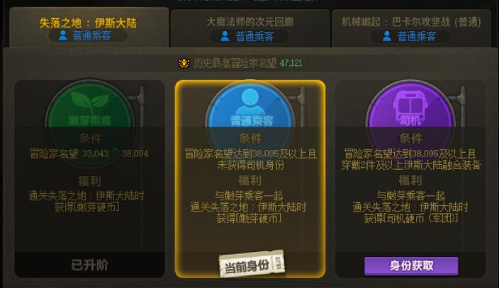 在失落之地:伊斯大陆中,名望值小于等于38094点的角色身份固定为嫩芽乘客,名望值大于38095点的角色身份默认为普通乘客,名望值大于等于38095点且首饰贴膜大于等于2件的角色可以获取司机身份。