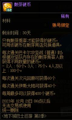 在活动期间内,玩家与嫩芽乘客一起通关军团地下城或巴卡尔团本普通难度时,可以根据玩家身份获得对应不同类别的活动硬币,各类活动硬币可以在商店中兑换丰厚的奖励,与第1季活动的玩法基本类似。