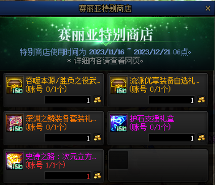 所以从总体上来说,史诗之路更适合小号去轮番刷,这样每个小号都能得到有效的提升。即使是新建角色也可以在赛利亚特别商店处直接获得各种基础装备。