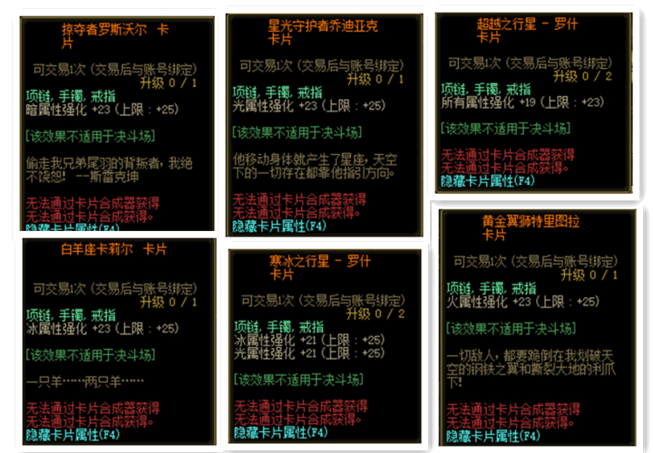 首饰:对比增加18、20、22属强的神器卡片价格,选择传说卡片性价比最高,这些传说卡的价格均在250万左右,因升级卡片代价较高,并不建议小伙伴们升级使用。、寒冰之行星-罗什(火光21)、超越之行星-罗什(21全属强)、黄金翼狮特里图拉(火23)、白羊座卡莉尔(冰23)、星光守护者乔迪亚克(23光)、掠夺者罗斯沃尔(23暗)