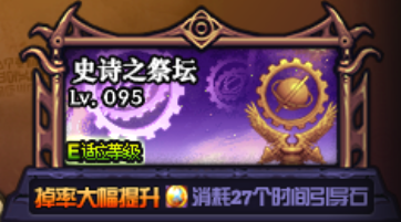 史诗之祭坛,每次进入需要花费8点疲劳值,无进入限制,每次进入需要27个时间引导石,掉落装备可以分解,可以跨界,可以使用期限的时间引导石,但不能使用智慧的引导通行证。