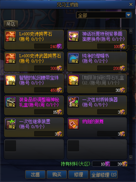 引导石(每周)>调整箱(每周)>神话祈愿特别背景>史诗武器跨界石>纯净的增幅书>轮回腰带宝珠>继承装置>材质转换器