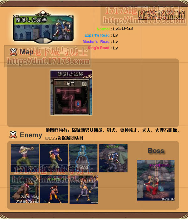 地图怪物有:盗贼团男女团员,猎犬,鬼神疾走,犬人,大理石雕像,BOSS为盗贼团头目