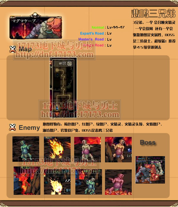 地图怪物有:褐色僵尸、红僵尸、绿僵尸、火精灵、火精灵头领、火焰僵尸、油坊僵尸、岩浆食尸鬼。BOSS是悲鸣三兄弟