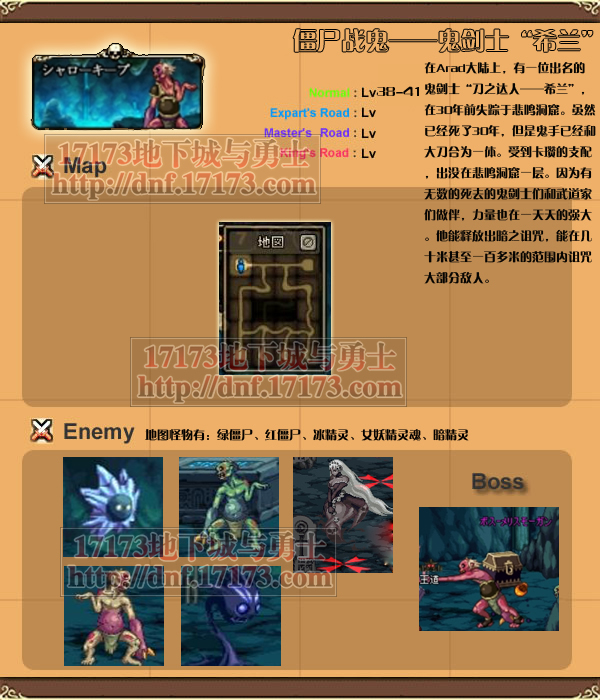 在Arad大陆上,有一位出名的鬼剑士“刀之达人——希兰”,在30年前失踪于悲鸣洞窟。虽然已经死了30年,但是鬼手已经和大刀合为一体。受到卡瓒的支配,出没在悲鸣洞窟一层。因为有无数的死去的鬼剑士们和武道家们做伴,力量也在一天天的强大。他能释放出暗之诅咒,能在几十米甚至一百多米的范围内诅咒大部分敌人。