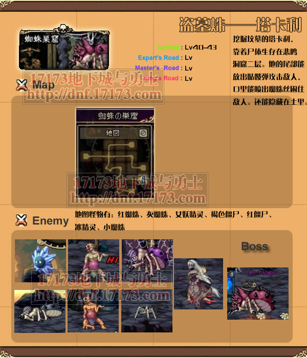 这里都是死去的鬼剑士和死去的武道家们的天下。因为灵魂被卡瓒所控制,自己的肉体也受到变异,慢慢的退化为僵尸形态。还有许多的盗墓蜘蛛,可以说是地狱中的地狱。。。