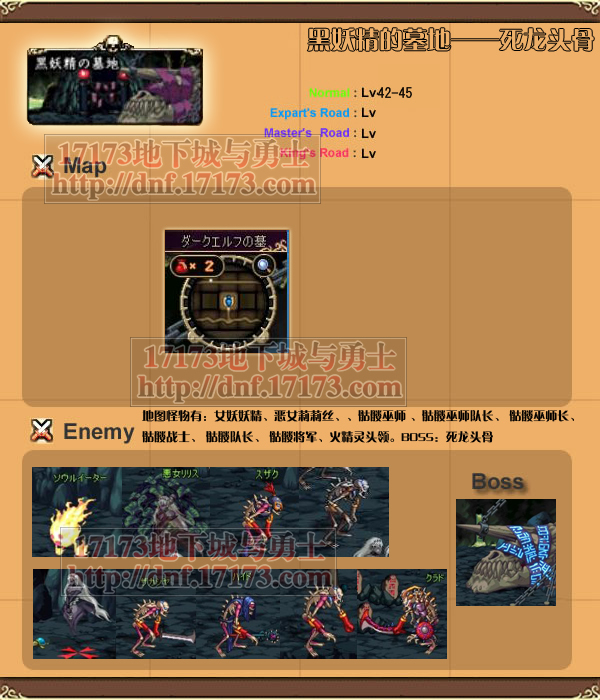 女妖妖精、恶女莉莉丝、、骷髅巫师 、骷髅巫师队长、 骷髅巫师长、骷髅战士、 骷髅队长、 ****、火精灵头领。BOSS:死龙头骨