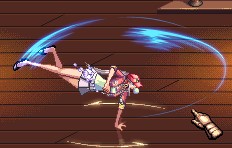 招牌体术,对应键位↓↓+X,CD时间4S,女漫游是类似体操动作的回旋踢接手倒立,手撑地后身体空中旋转单脚回旋踢,范围比男漫游的标准回旋踢双脚回旋要大一些,判定为中下段范围攻击,可扫地追加,技能级别越高,发动速度越快,最大LV20。