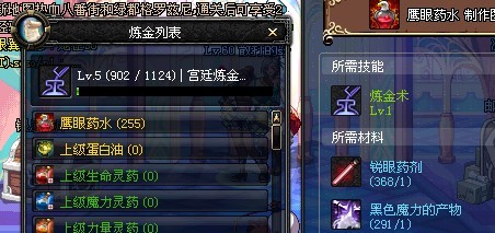 先说说炼金术士经验值是如何获得,在副职业窗口里,绿色字显示的是同级药剂,100%成功,经验约莫是1.5一个。黄色字显示的是高1级药剂,经验约莫是2一个,成功率约2/3。红色字显示的是高2级药剂,经验暂时不清楚没注意,成功率约1/3。无色字的是低1级或更多级的药,根据我升级过程,低1级的药应该0.2-0.3经验一瓶,低2级以上的没经验。