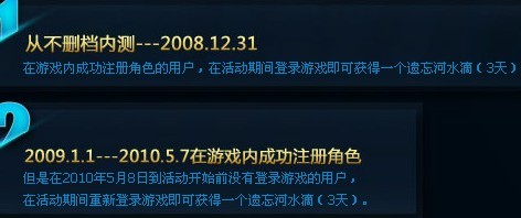 首先是领取洗点水——遗忘河水滴的条件,今年5月7号以后才建立游戏角色的玩家就不会有水滴送了哦。