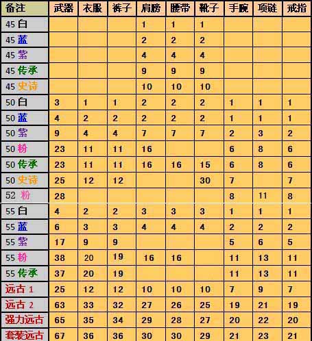 普通掉落:戒指、腰带BOSS掉裤子 冒险掉落:手镯、肩膀BOSS掉衣服 困难掉落:项链、鞋子BOSS掉武器 王者掉落:全部加强版BOSS掉套装