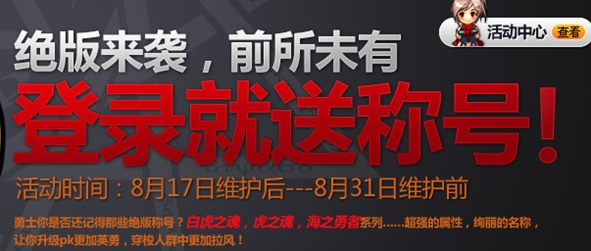 活动内容:勇士你是否还记得那些绝版称号?白虎之魂,虎之魂,海之勇者系列……超强的属性,绚丽的名称,让你升级pk更加英勇,穿梭人群中更加拉风!现在,登录就有这些绝版称号送!活动期间每天登录游戏,就能免费得一个超好的称号,天天都能拿,天天好礼送不停!