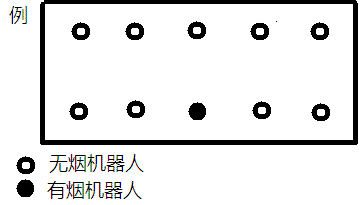6.召唤倒数机器人:BOSS自身进入无敌状态,并在地图上下召唤纵向排列两行倒数机器人。每行5个,一共10个,分布略图如下(图例只是其中的一种情况)。10个机器人中只有1个是有烟机器人,剩下9个都是无烟机器人,4秒倒数完毕后,有烟机器人损坏,放出HP为1保护罩;无烟机器人爆炸,大范围物理伤害99999。