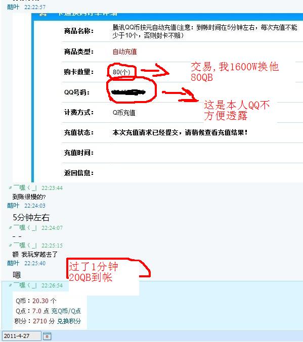 这次是我跟他交易1600W换80QB。对于平民来说攒到1600W不容易。换点QB来买时装啥的。开头他给你看下张图片,显示他已经帮你充了QB(他发的是假图。)说是要等1小段时间。